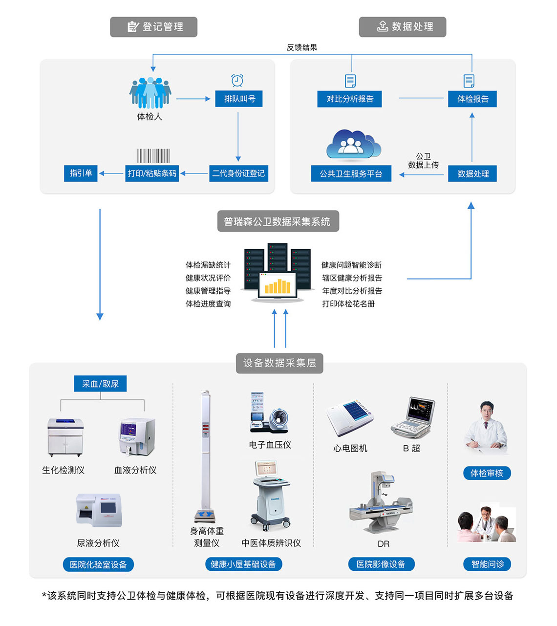 普瑞森公共衛(wèi)生數(shù)據(jù)智能采集系統(tǒng)院內(nèi)專業(yè)體檢方案,是在基層醫(yī)療機(jī)構(gòu)搭建一套適用于公衛(wèi)體檢、健康體檢、健康教育、健康管理為一體的健康管理中心,深度集成公共衛(wèi)生體檢基礎(chǔ)設(shè)備,無(wú)縫鏈接醫(yī)療機(jī)構(gòu)現(xiàn)有的心電設(shè)備、超聲檢查設(shè)備、化驗(yàn)室設(shè)備,結(jié)合內(nèi)科、外科、中醫(yī)科等科室專業(yè)問(wèn)診,實(shí)現(xiàn)居民快速建檔,體檢數(shù)據(jù)自動(dòng)采集,體檢報(bào)告自助打印、體檢數(shù)據(jù)自動(dòng)上傳至當(dāng)?shù)鼗竟残l(wèi)生服務(wù)平臺(tái)的全功能應(yīng)用。