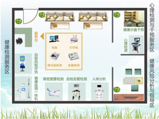 居民健康小屋為社區(qū)居民提供常規(guī)的檢查項目,主要項目有血糖、血壓、肺功能、骨密度、身高體重、心電圖等常規(guī)的檢測項目,居民能在社區(qū)服務(wù)中心進(jìn)行“健康小屋”免