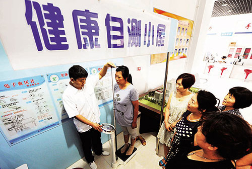 自助式健康小屋主要配備心電圖、人體脂肪、血壓、身高體重、骨密度、血糖、肺功能及心血管功能八個檢測項目。全部完成后會打印報告單,同時還有健康知識的宣教。